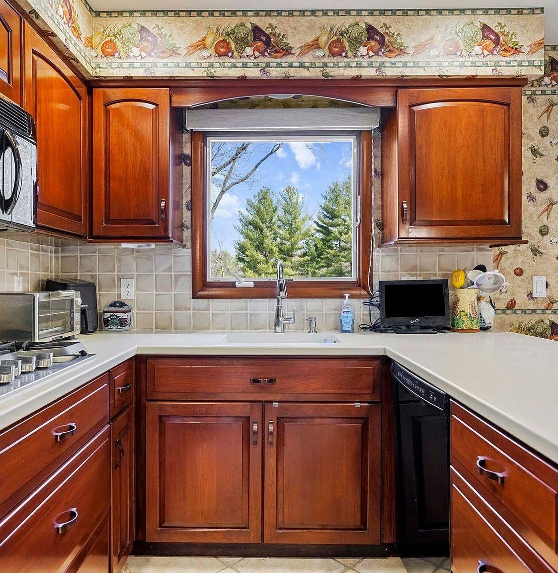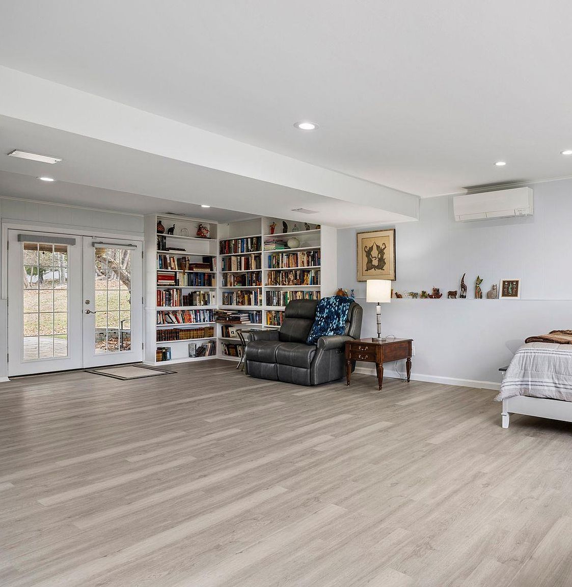 This expansive lower level retreat offers endless possibilities with its own kitchenette, laundry room, and walk out patio. Recently renovated with luxurious flooring and custom built-in shelving, the space flows effortlessly through French doors to outdoor entertaining areas. Recessed lighting and crisp white walls create a bright, welcoming environment perfect for recreation, relaxation, or hosting guests.